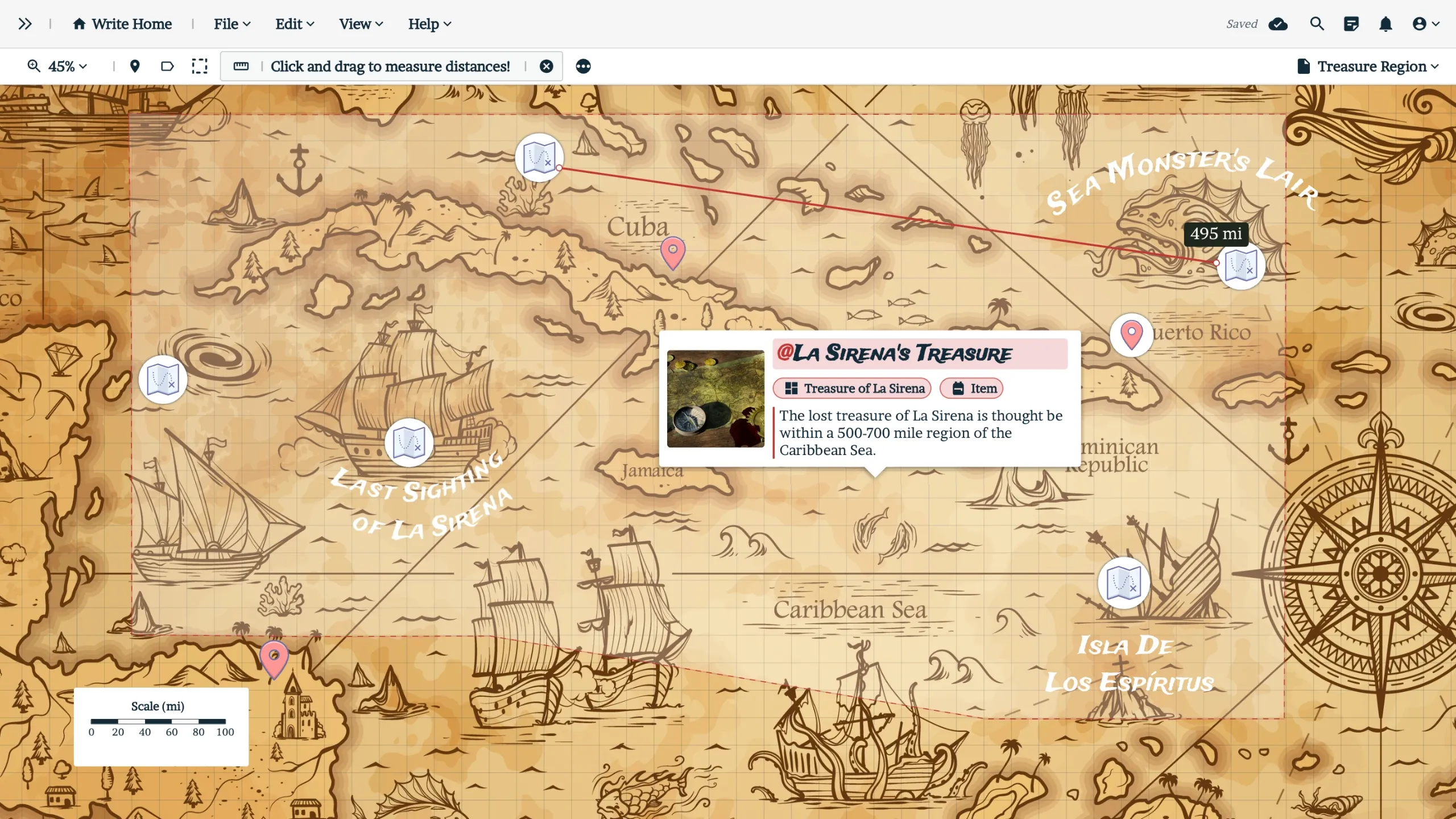 Create scales using imperial, metric, or custom units, and follow character journeys and rumored myths across your setting to the precise distance with a handy ruler.