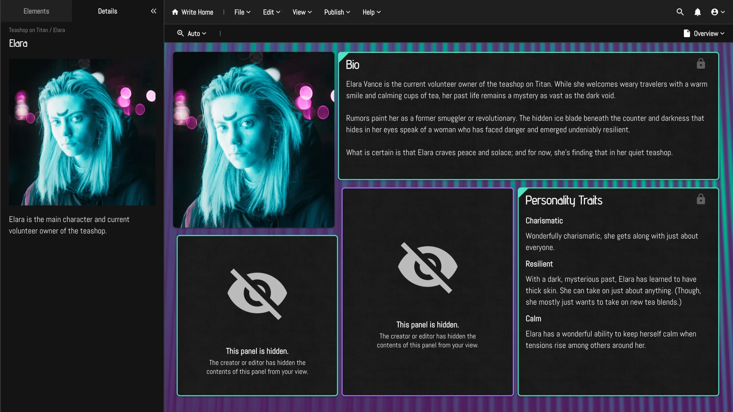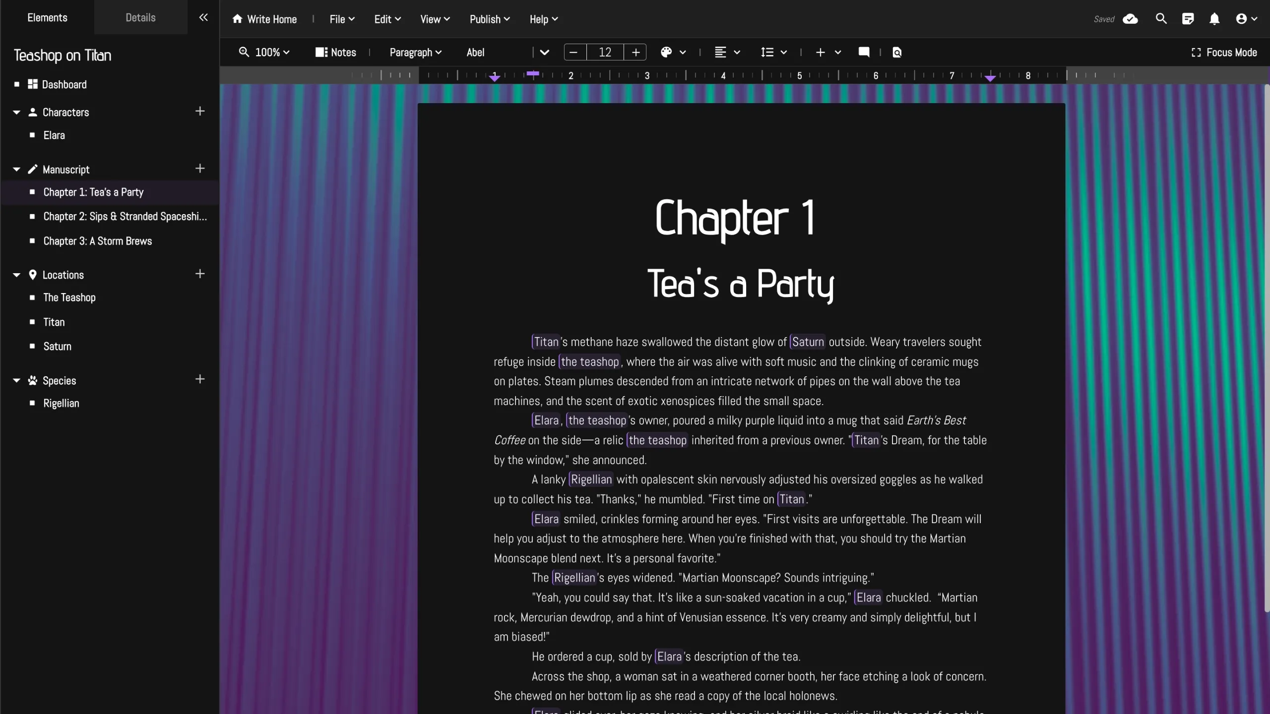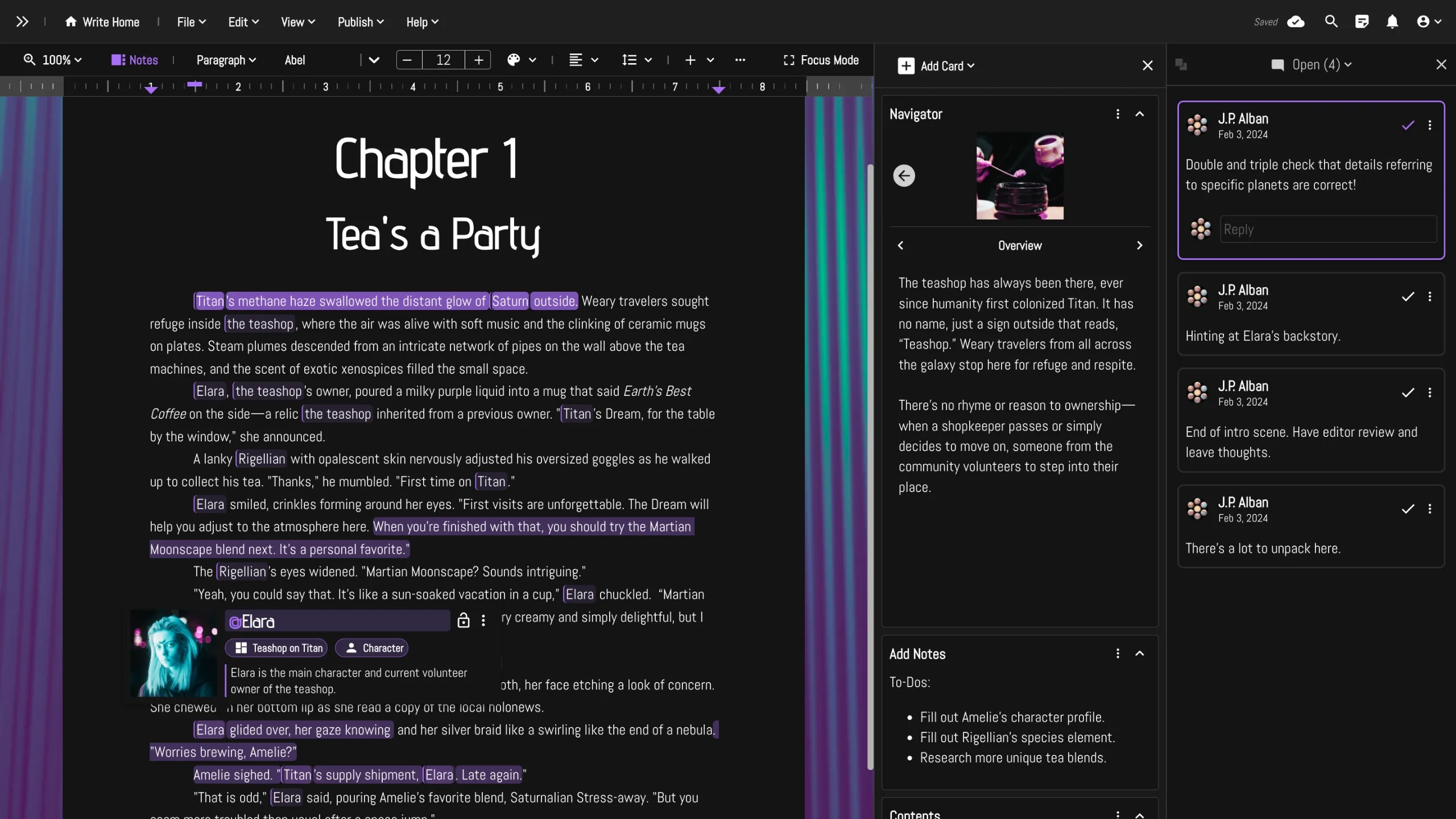 Our modular writing and worldbuilding tools support your manuscript with better organization and seamless connection at every stage of your drafting process.