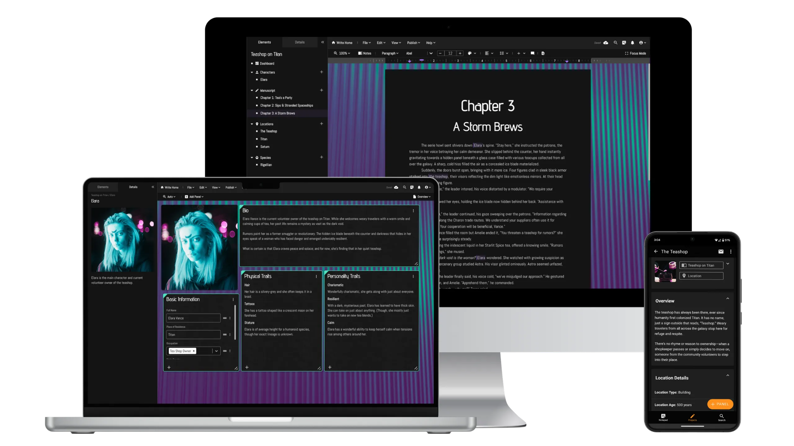 Plot starry-eyed adventures from under the covers, dream up a coffee shop meet-cute over a latte, or draft a labyrinthine twist from your local library with our browser, desktop, and mobile apps.