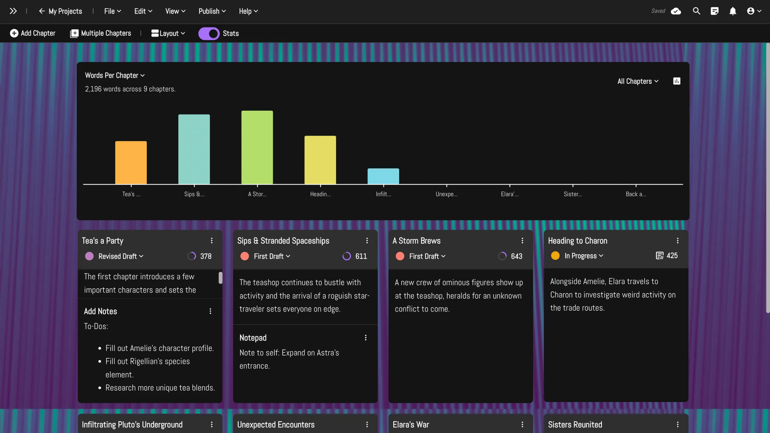 Set manuscript and chapter goals, and keep track of your stats as you write!