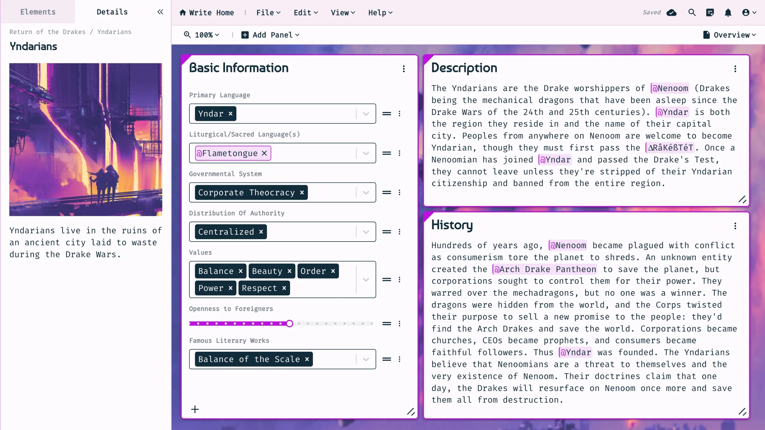 Campfire has created an interactive space that automatically links to my worldbuilding. I can, with a single click, see a character's hair colour, or the year my town was founded, without having to leave the document I am working on.