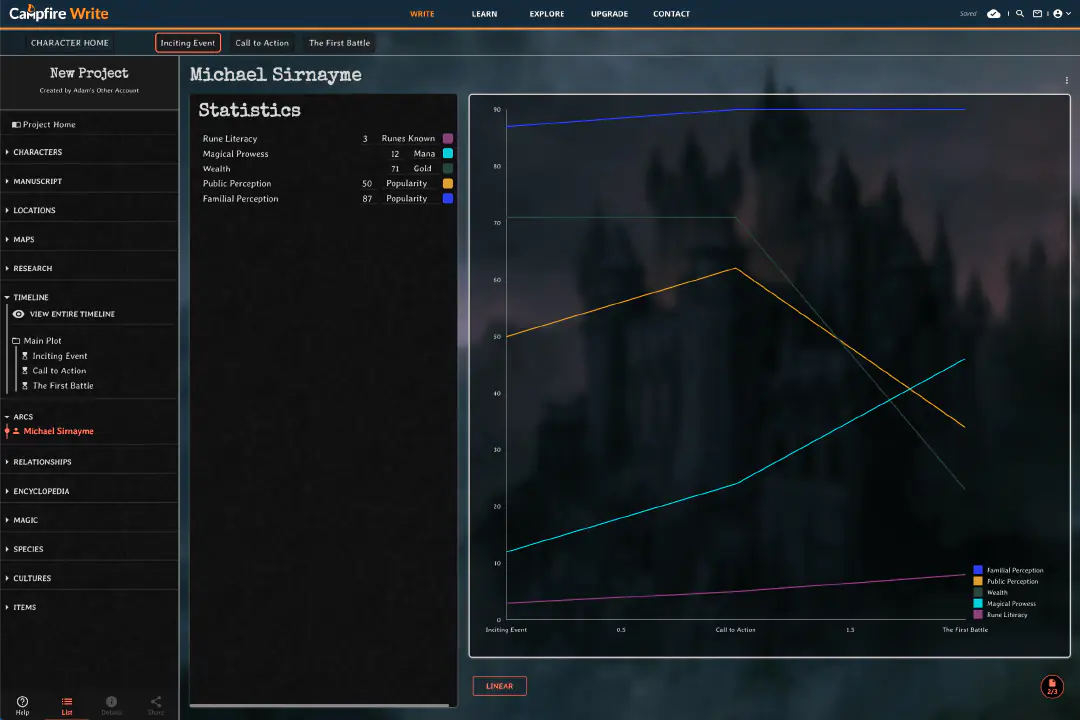 Wouldn't it be nice to have an actual graph to show your characters' arcs? The Arcs Module helps you do just that—but not just for characters. Once you’ve created an eligible element and linked it to a few events in your timeline you can show how it changes over time!