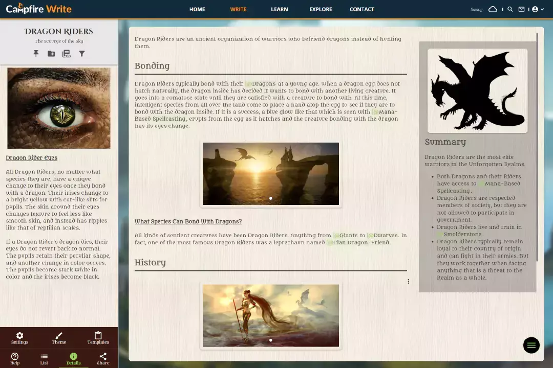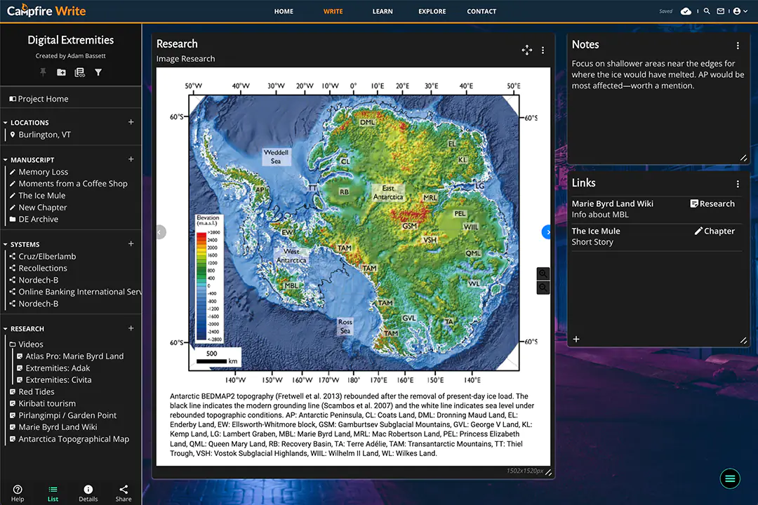 Store your webpages, videos, images, PDFs, and any notes you might need right within Campfire's Research Module. It’s great for historical fiction, taking inspiration from the real world, or writing nonfiction!