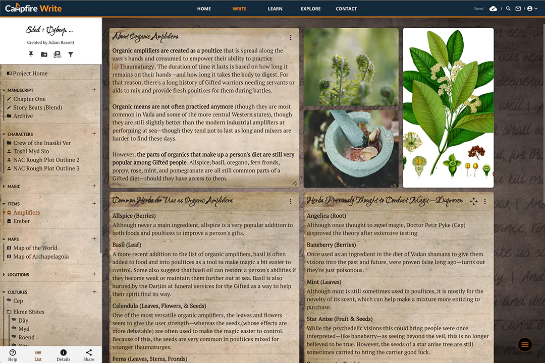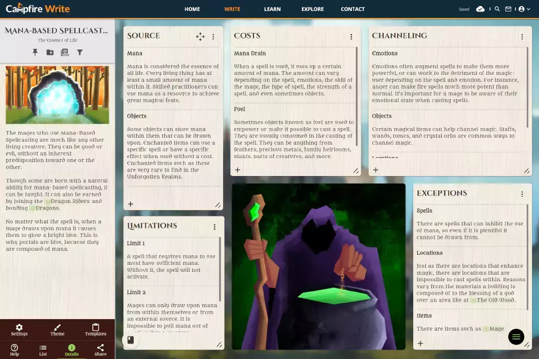 Campfire is composed of seventeen modules, each one offering a different way to organize your notes, write your story, or worldbuild. Try each one for free!