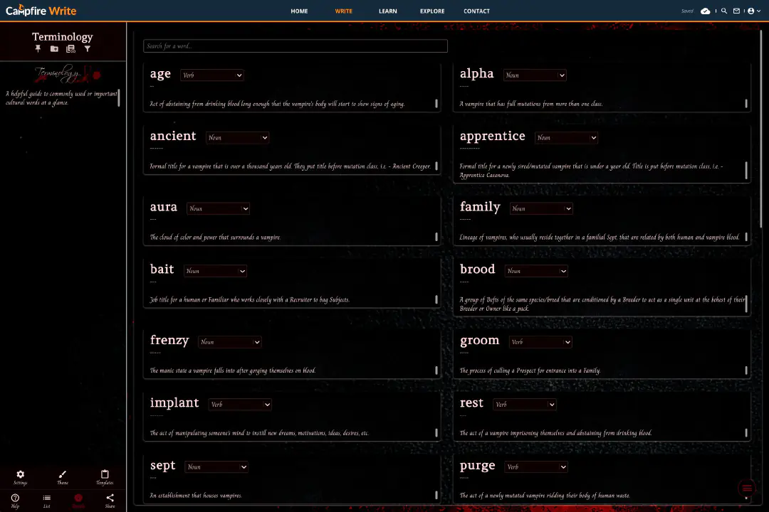 Does your setting feature unique languages or terms? The Languages Module is the perfect place to build a conlang (constructed language) for your world. Plus, while you’re writing, you can create new words on the fly!