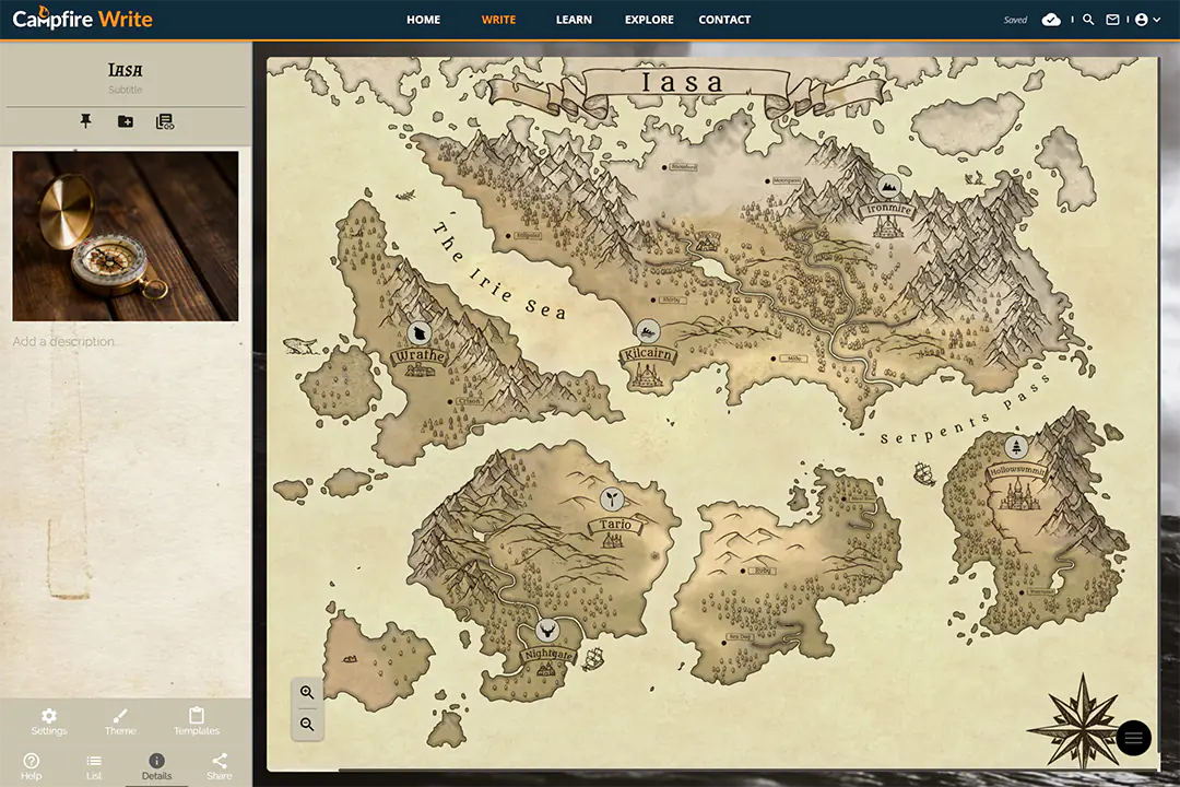 Upload your map to the Maps Module, add pins to integrate it with the rest of your story, and nest other maps to keep things organized.