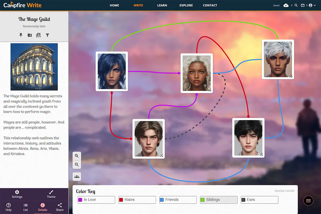 With the Relationships Module, create visual representations of your characters' relationships or intricate family trees. In the Systems Module, illustrate how a group or social construct works by connecting its different components.