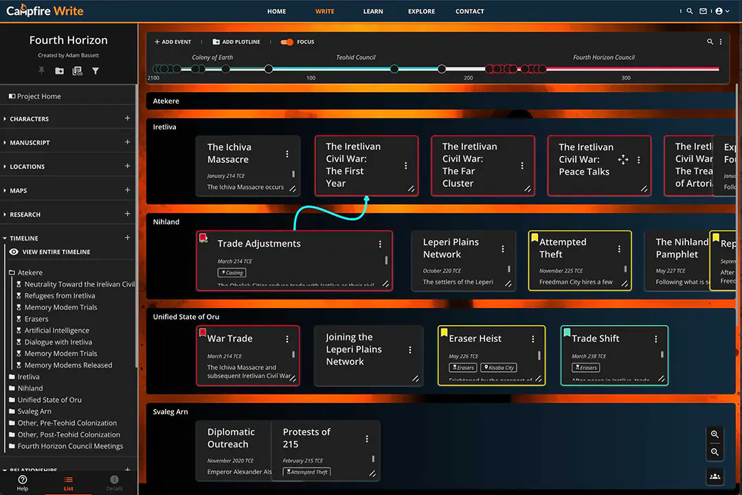 The Timeline Module allows you to create events that track what happens in your story. Use multiple plotlines to represent different story arcs in the timeline.