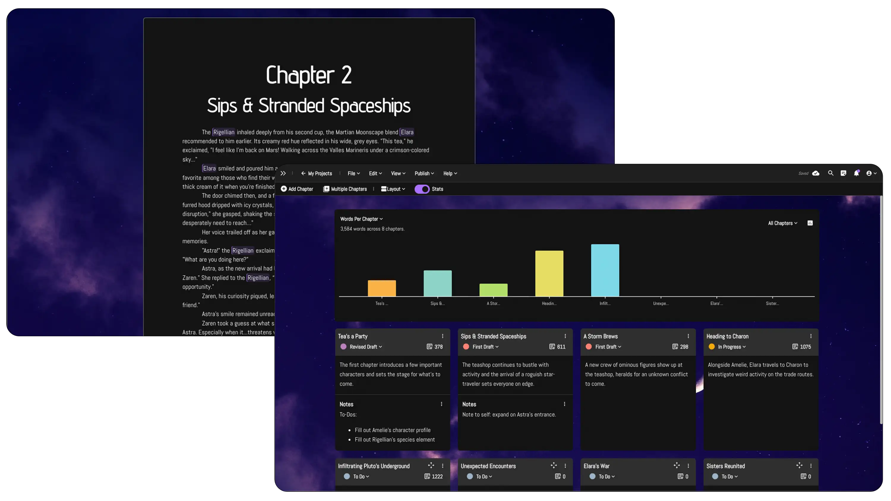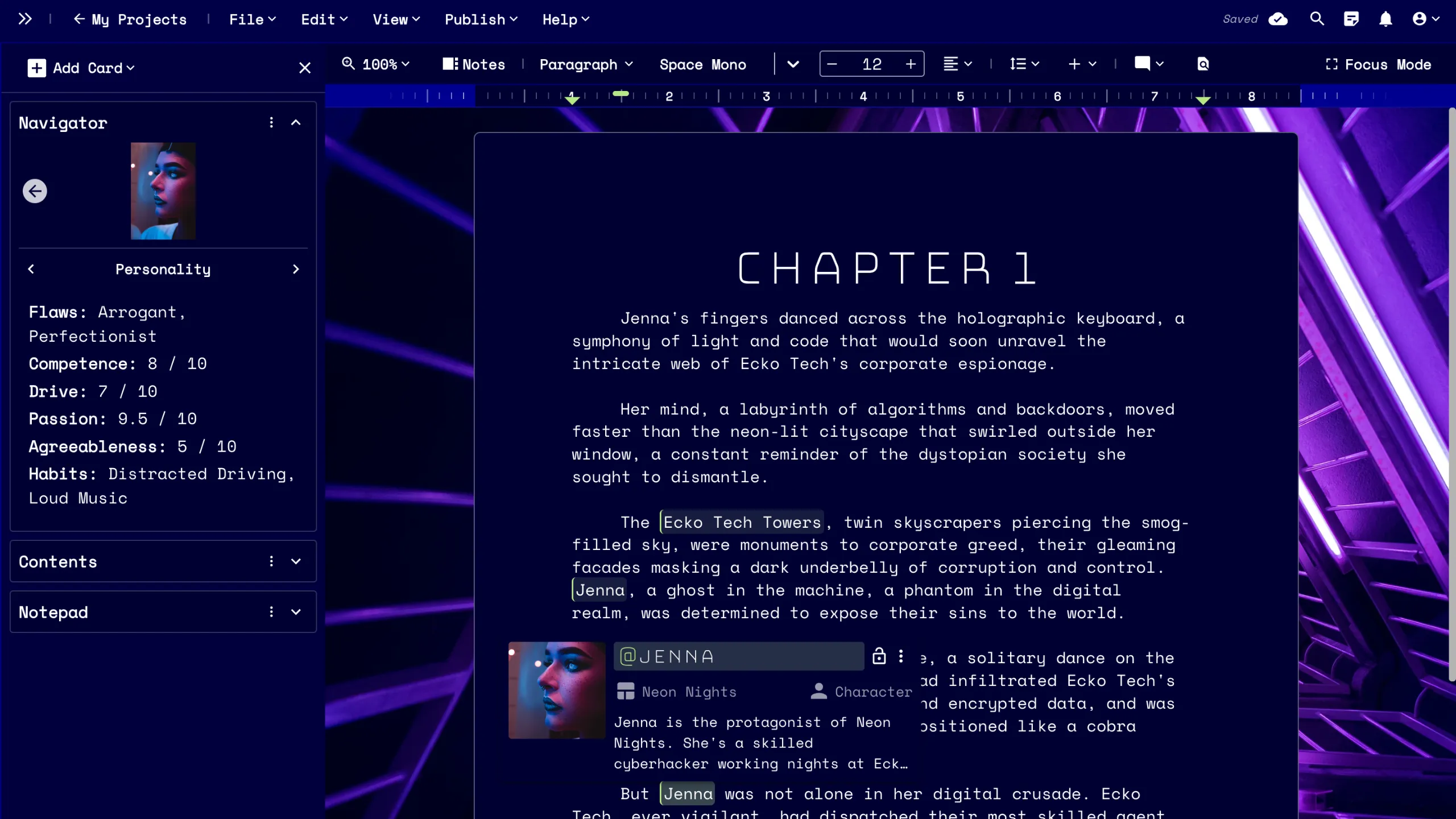 Tag your story elements directly in your manuscript, and toggle open a sidebar to access your notes while drafting. If inspiration strikes in the middle of a writing session, open your project-wide notepad to jot it down for later reference.
