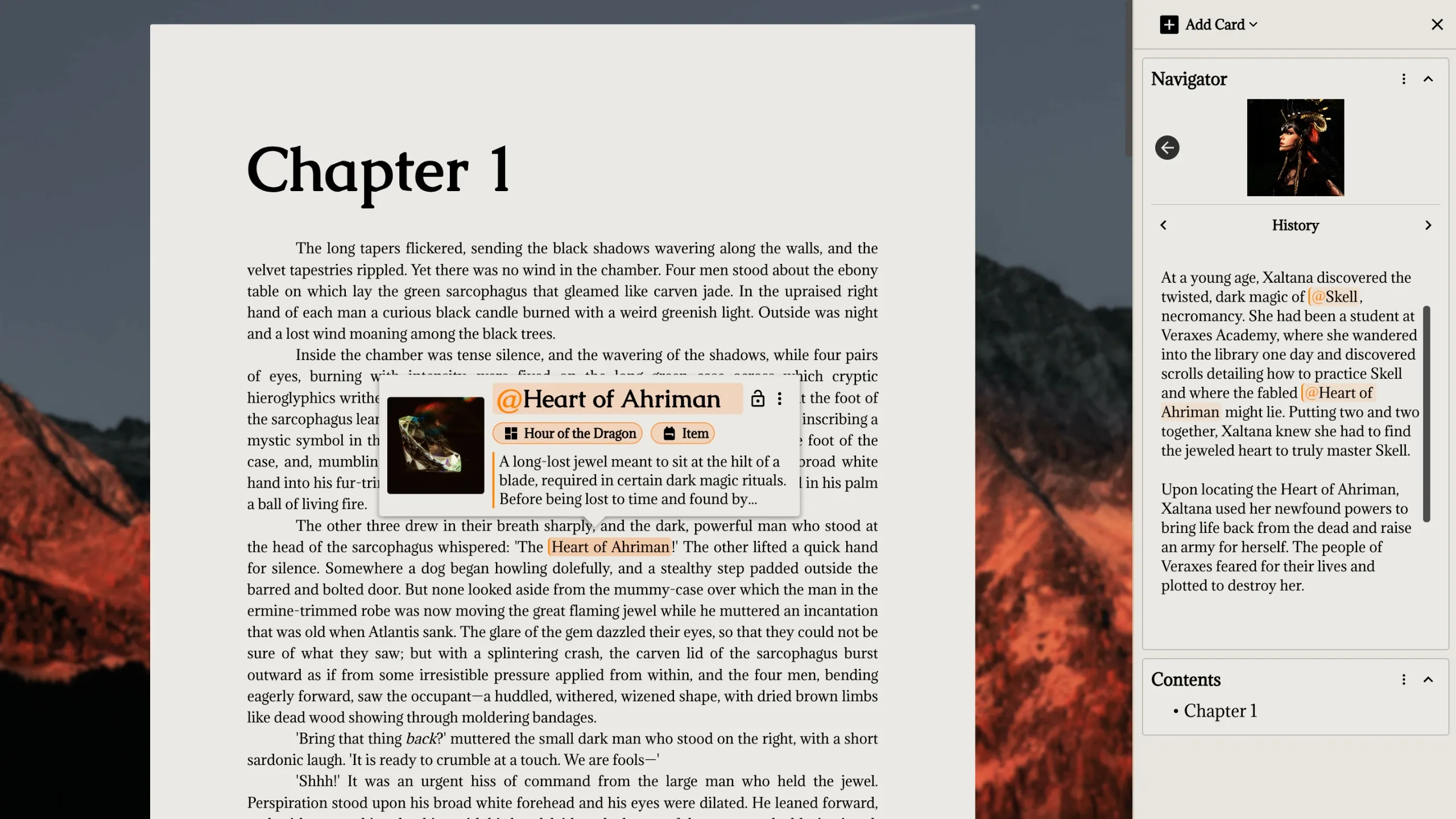 The Manuscript Module doubles as a portal to the secondary worlds you’ve dreamt up on Campfire. Journey to a tailored writing space with features like Focus Mode and custom project themes.