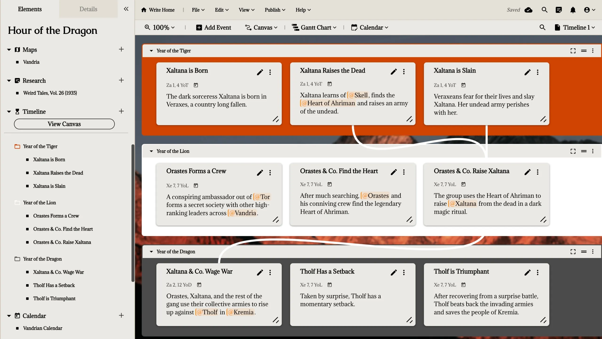 Use the Timeline Module’s adaptable canvas to plot your story’s timeline from the Chosen One’s birth to the King’s Untimely Death. Plan your tangled web of events from the highest level to the tiniest detail.