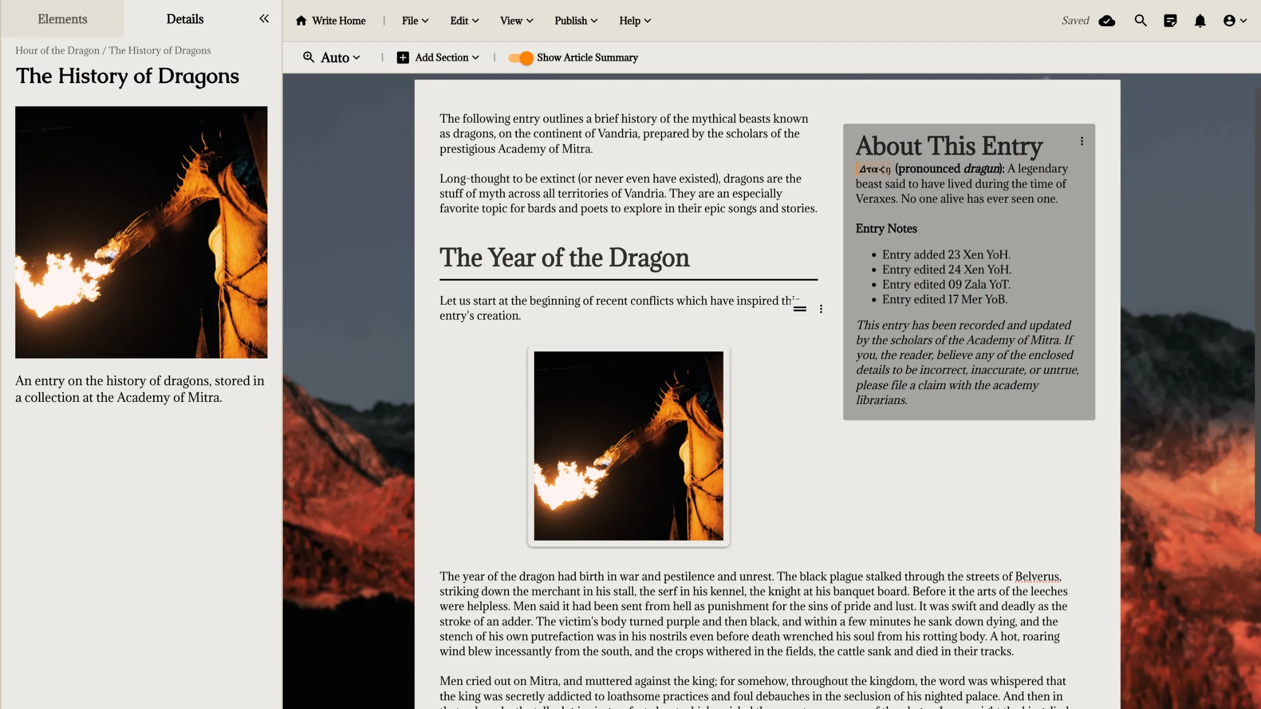 Campfire’s hybrid book writing app and publishing platform comprises modular writing and worldbuilding tools uniquely that cater to the extraordinary realms you conjure up as a fantasy author. It’s free to get started.