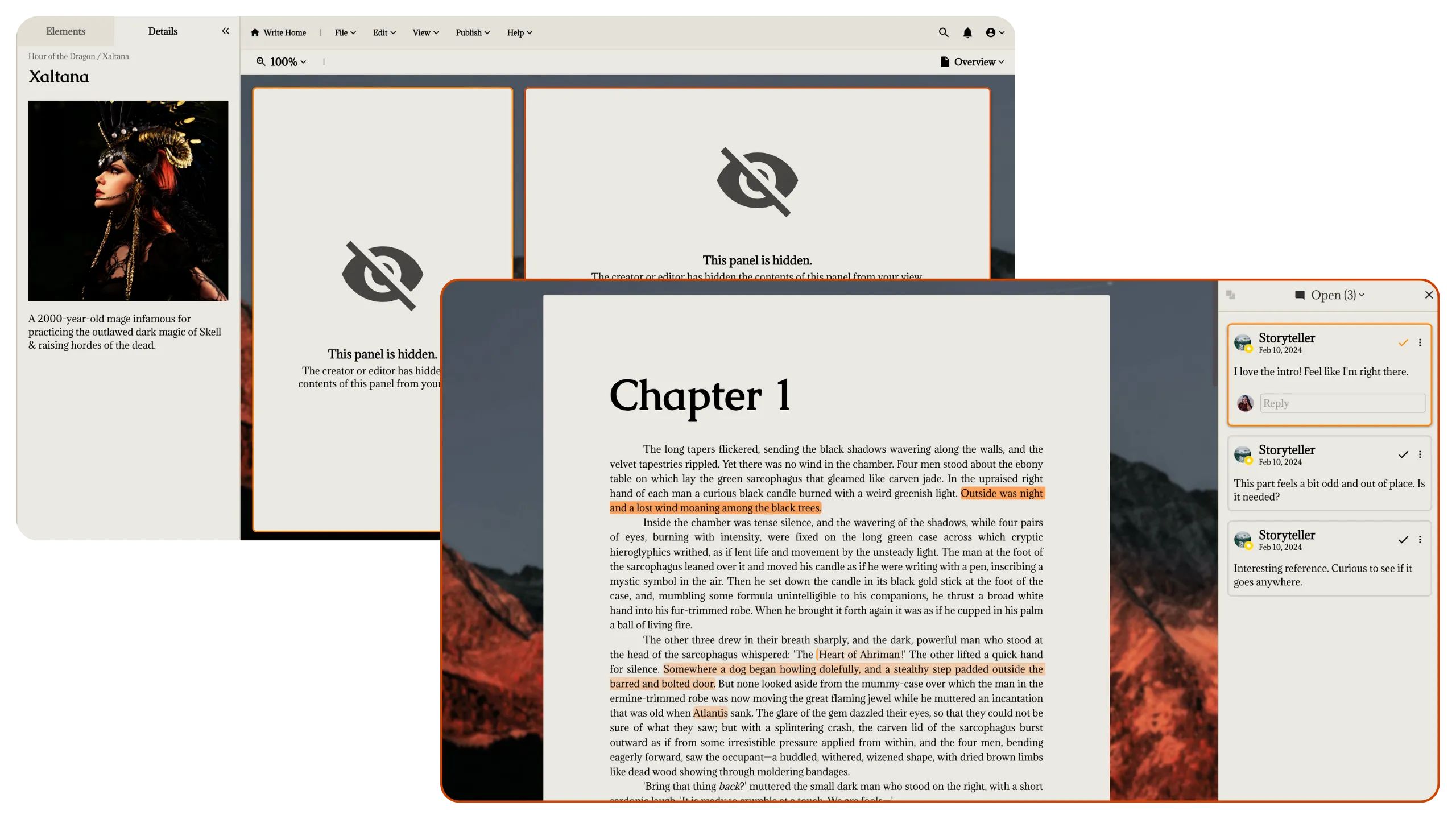 After writing your fantasy novel, you can opt to self-publish and monetize your book with bonus content right to Campfire’s reading platform. Looking to publish elsewhere? We’ve got you covered there, too.